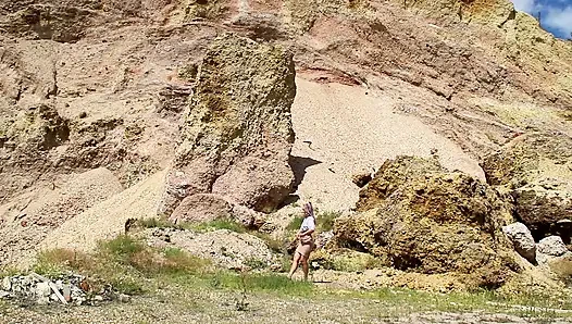 Külotsuz ve açık meme uçlu sutyenli bir bayan tarafından etek deniyor